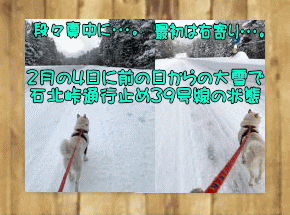 今年は降雪が少なくて、雪掻きの手間がなくて楽だなって、喜んでいたのですが、2月人ってすぐに大雪に見舞われ、やっぱり甘くはないことを思い知らされました。写真右は大雪で石北峠は通行止めになり、前の日から雪が降り続いていたので、ウチの看板犬モンちゃんを散歩に連れて行くことが出来ませんでした。翌日は周囲の雪掻きが、ひと段落付いたので、モンちゃんを散歩に連れ出しました。ところが分かってはいたのですが、いつも散歩する林道は私の首のところまで雪が積もっていて、入る事が出来ませんでした。仕方なく綺麗に除雪された39号線車道を最初は、路肩側を謙虚に散歩していたのですが、通行止めで全く車が通っていないので、段々道の中心寄って行ってしまって、とうとう真中を歩き出したので、いくら車が全く通っていないといっても、やっぱりこれはまずいと思い、中心に寄って行くモンちゃんを、路肩に引っ張りながら帰ってきました。通行止めで無ければあり得ないお散歩風景ですね。 |